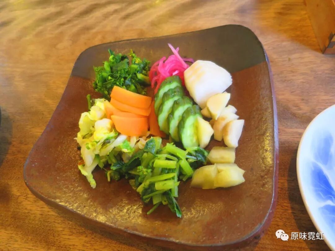 白菜,胡萝卜,茄子,大根和菊菜都是最时令的野菜,用胡麻和味增调味,非常香