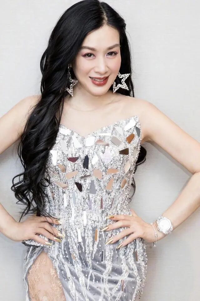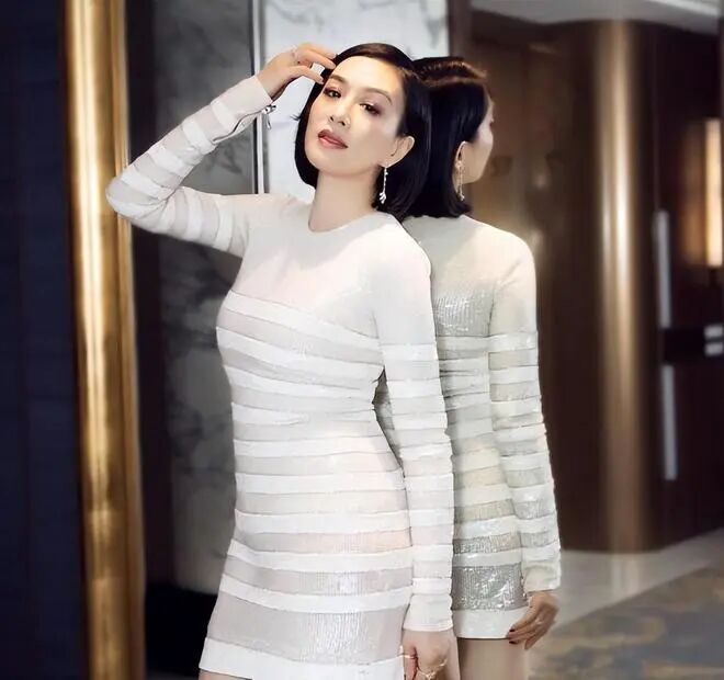 不管是钻石首饰,还是奢华的珠宝,都可以让简约的穿搭变得更加出彩。钟丽缇穿钻石裙,搭配奢华的钻石耳坠,整个人的气质高级又出彩,彰显着十足的贵气美。