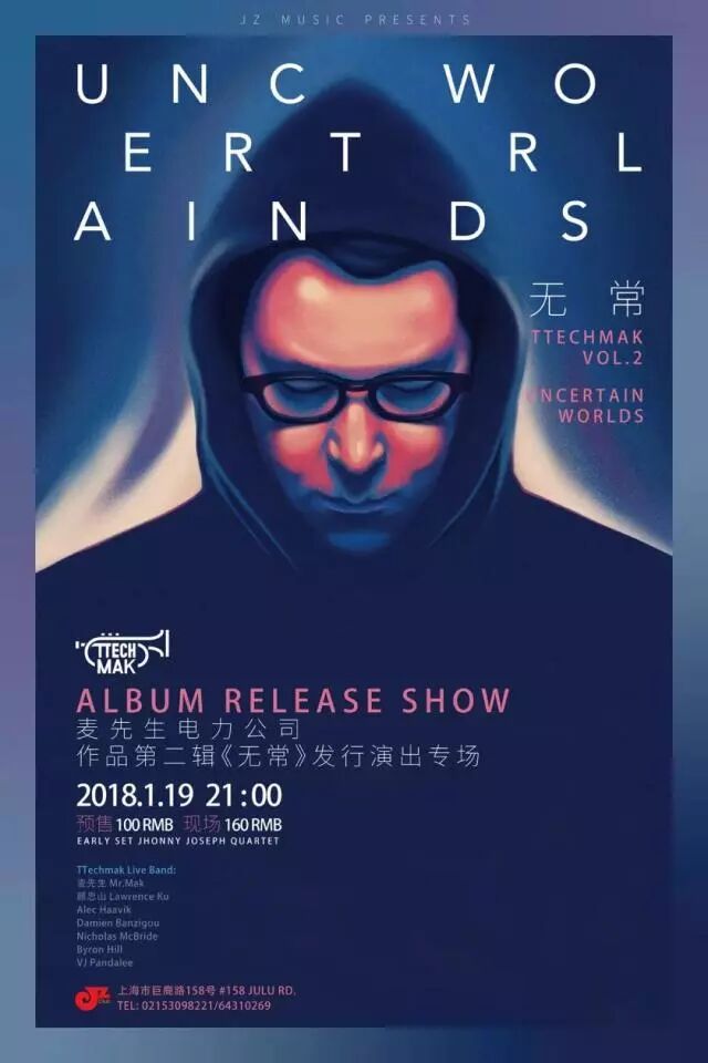 2017年末最酷最炫最变幻无常的爵士电子专辑非“麦先生电力公司”(TTechmak)的新作《Uncertain Worlds无常》莫属!细腻而又不失奇思妙想的怪异节奏,奇特音符泛着冷色调微光,爆裂的电音伴随着爵士和声,复古的、模拟的、流畅却又现代的——澳籍爵士小号手、作曲家、制作人Toby Mak 的爵士电子音乐计划“麦先生电力公司”推出的全新原创专辑,集合十位优秀的音乐人,联手为大家呈现了一幅天马行空、精彩绝伦的另类世界。