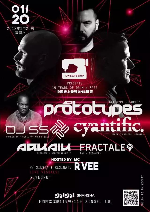 为庆祝Sweatshop「血汗工厂」团队第十九年推动鼓打贝斯的里程碑,我们将举办中国电音史上最强大的drum'n'bass现场阵容:Cyantific, The Prototypes和dnb传奇人物DJ SS三巨头大咖同场出演,加上MC R Vee喊麦助阵,和Sweatshop DJ团队的支持,一定是中国Drum ’n’ Bass史上历史性的派对。