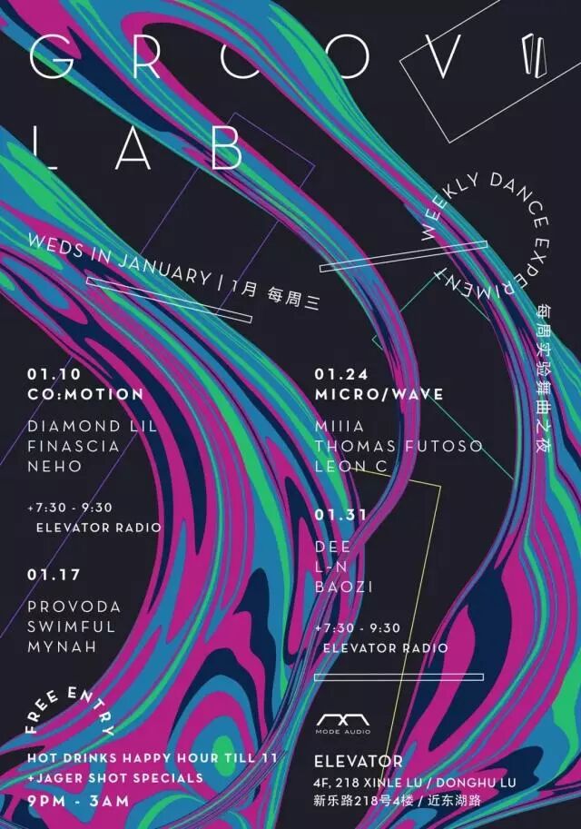 Elevator活力新推出!每周三聚集实力音乐组织Co:Motion、VOID和micro/wave等成员为爱尬舞的派对动物们准备琳琅满目、各色各类的音乐实验百科书大全。Elevator Radio将每月两次,在Groov Lab开始之前的7:30进行音乐广播在线放送。