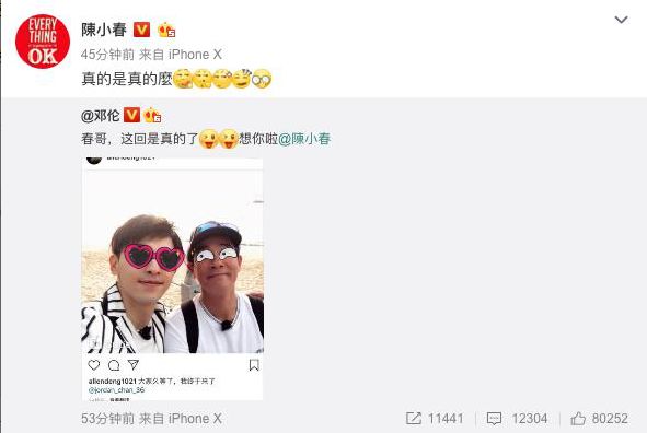 #陈小春关注邓伦假ins#上热搜之后,邓伦终于在微博上晒出了自己新开的ins账号,并配文:“春哥,这回是真的了,想你啦。”,随后,陈小春转发了邓伦的微博称:“真的是真的么。两兄弟也是超可爱的啦,经鉴定两人不是塑料兄弟情,毕竟邓伦为了陈小春开了ins啊!