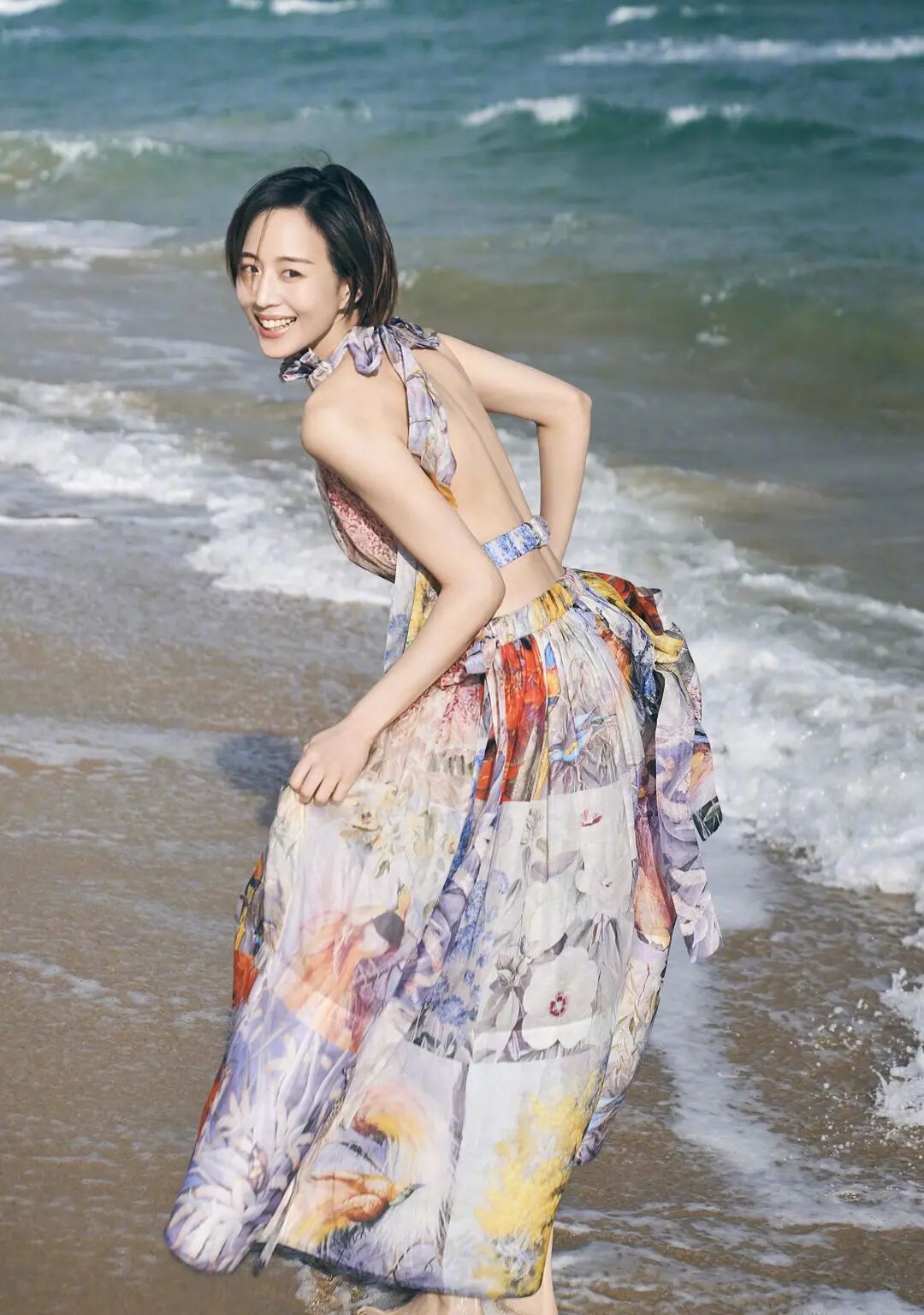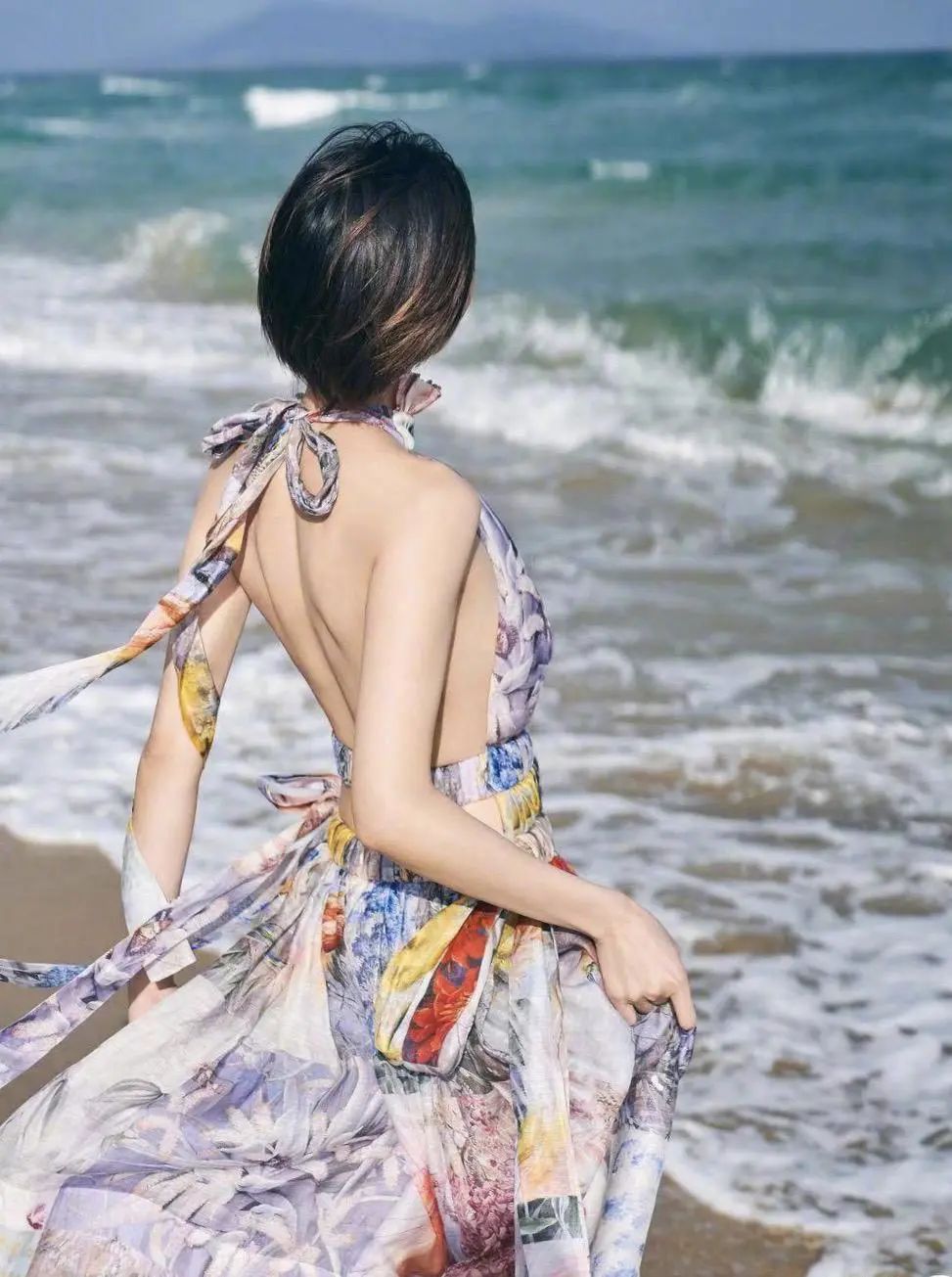 对比以往的其他造型张钧甯都是不走寻常路的,这款印花的挂脖式连衣裙,采取长款设计,满满的度假风,充满着热带风情。