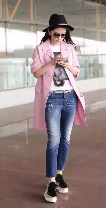 ▲看来冰冰们都很喜欢厚底鞋,李冰冰一身粉色的风衣,牛仔裤+厚底鞋的活力装扮,真是少女心满满的。