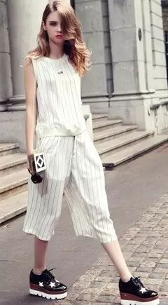 ▲厚底鞋怎么就不能搭阔腿裤?这位美博主一身极简的条纹休闲装,搭上星星鞋,也是霸气十足的!