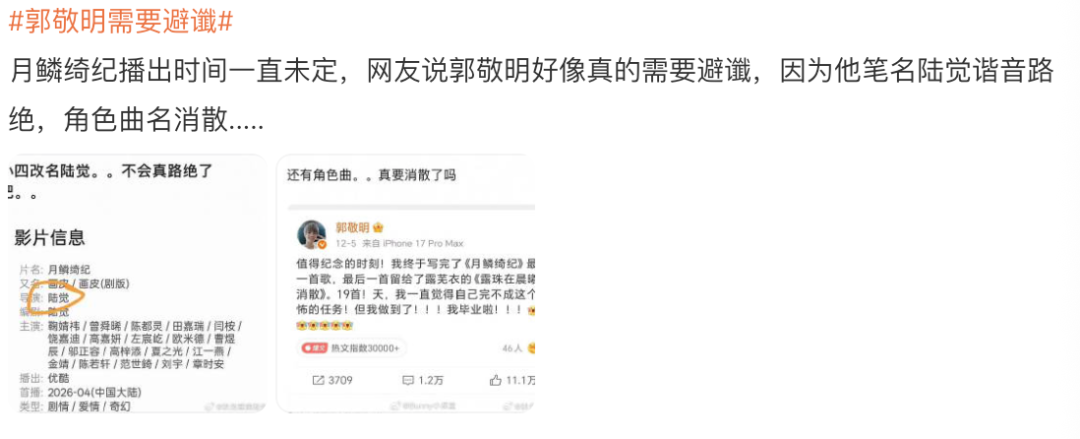 前不久鞠婧祎主演的《月鳞绮纪》网传定档,今天被女方公司发文否认和解,有网友觉得这基本断了剧能顺利抬上来的可能,另外还有一批看法集中在郭敬明身上,吐槽他新改的笔名“陆觉”不好(自打之前抄袭官司后,郭敬明用了很多不同的笔名),因为谐音“路绝”,等于“前路断绝”的意思,非常不吉利的名字,需要避谶一下。