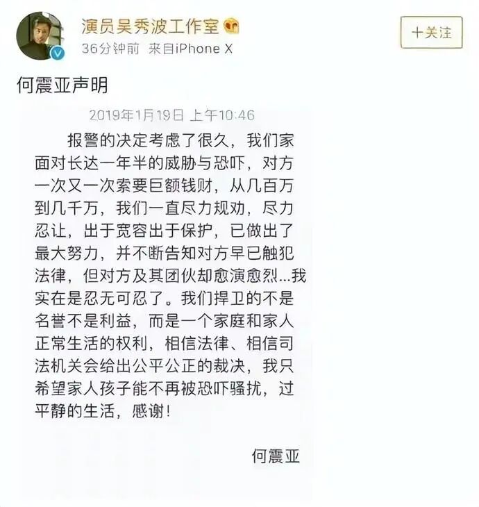 最后,还是吴秀波的妻子何震亚站了出来,借吴秀波的社交账号对此事进行了回应。表示在此之前,吴秀波已经被恐吓威胁很长时间了,实在忍受不了才选择报警处理此事,报警也只是为了捍卫一个家庭正常生活的权利。