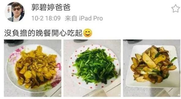 郭爸爸的社交帐号也更新动态,“没负担的晚餐开心吃起”: