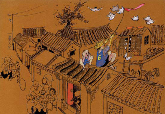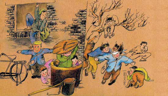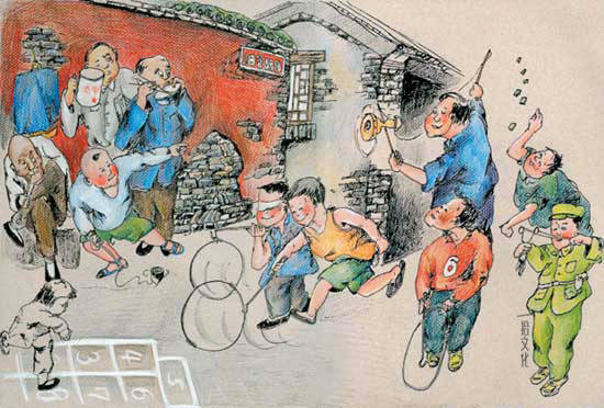 ▲铁环、抽陀螺、跳房子、空竹、羊拐、弹弓