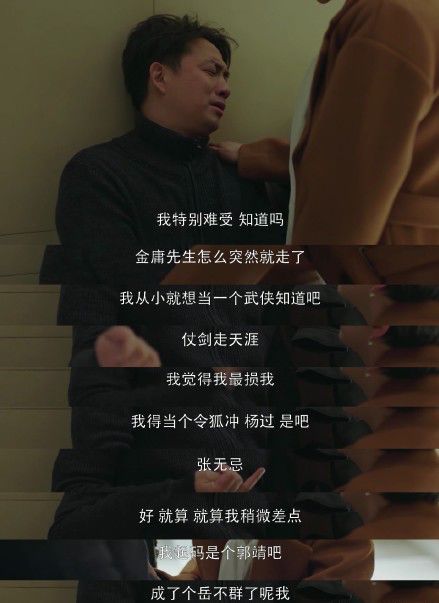 “我特别难受你知道吗?金庸怎么就去世了呢?年轻的时候我以为自己至少也能做个像令狐冲、杨过这样的大侠,最后我怎么就变成岳不群了呢?”