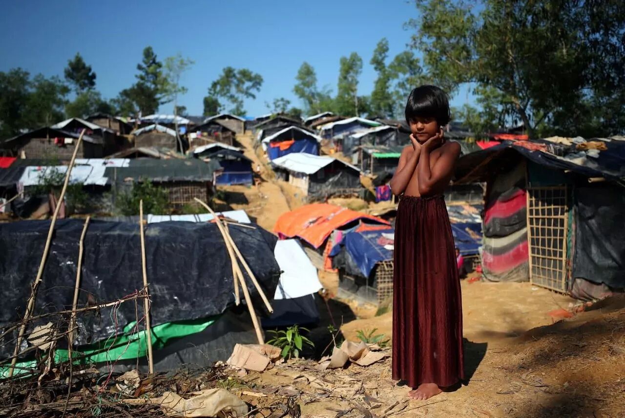 Zannat, an eight-year-old Rohingya refugee, stands at the entrance to Kutupalong refugee camp