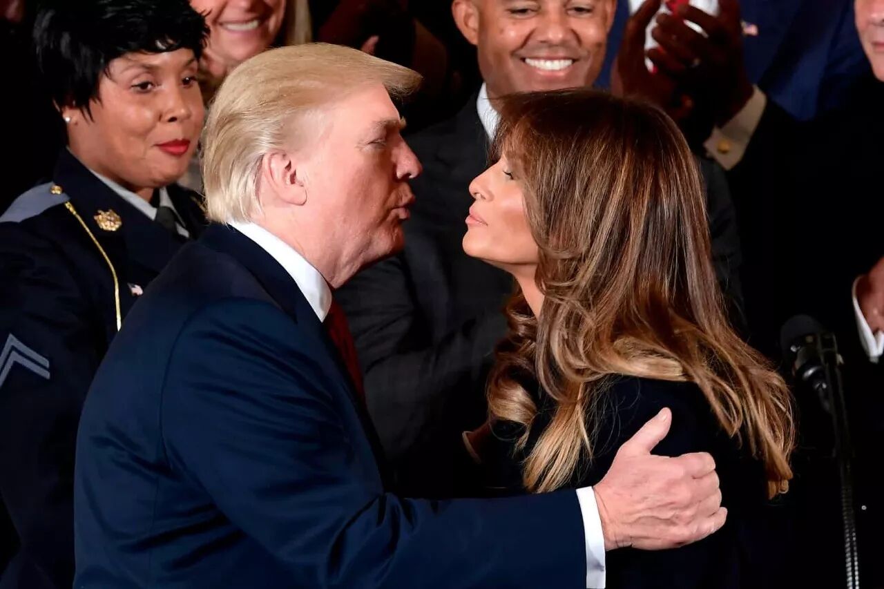 President Donald Trump embraces his wife Melania after she spoke about combatting the opioid crisis