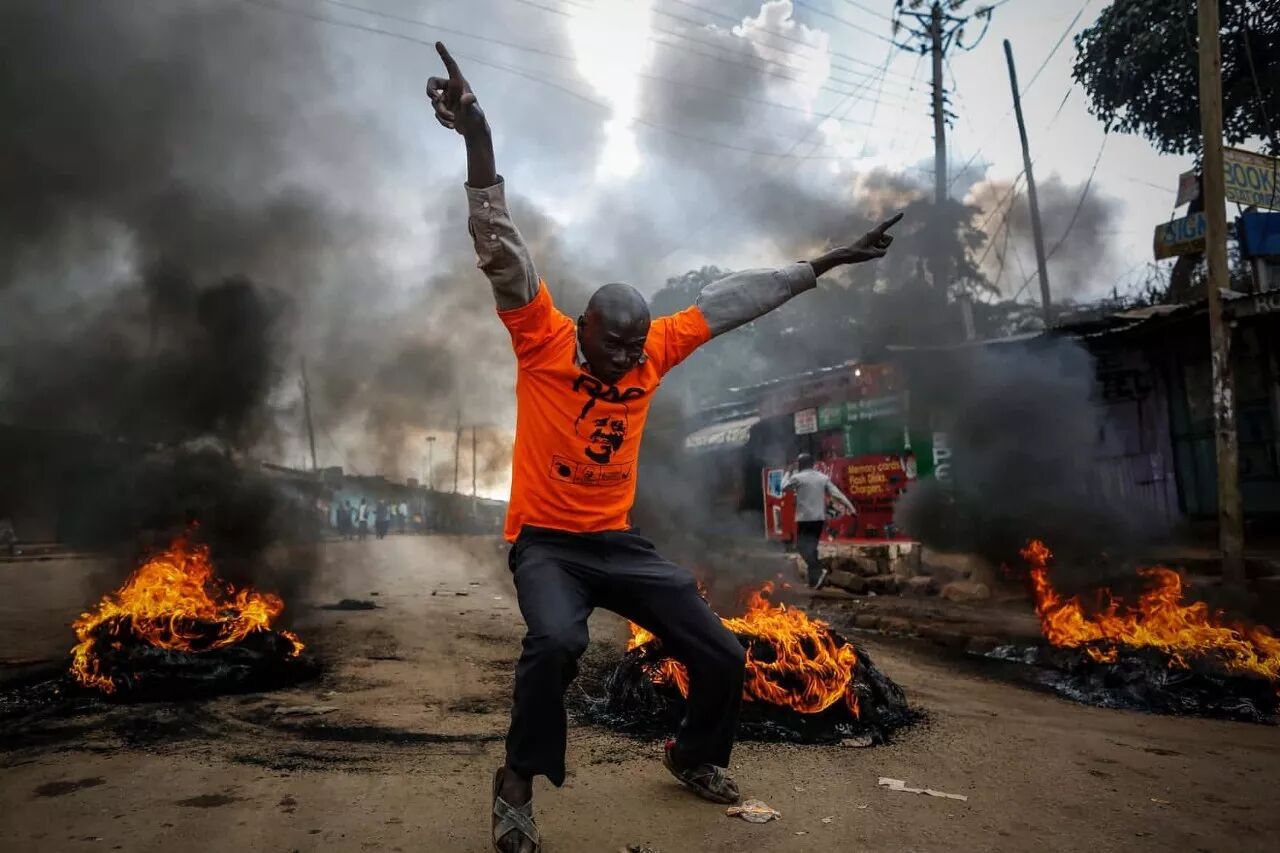 An opposition supporter in front of a burning barricade he and others set up to block vehicles from delivering electoral materials to the polling stations in their areas in the Kibera slum