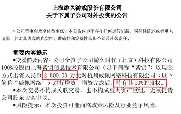 日前,游久游戏公布了投资LGD背后公司威佩网络的内容。悠久全资子公司紫钥,将以现金形式出资2,800.00万元对威佩网络进行投资,投资后,获得其注册资本的10%股权。