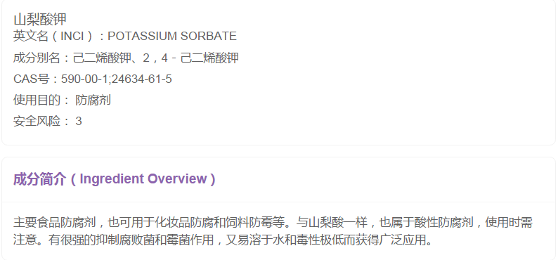 这类防腐剂就比较常见,食品级的防腐剂里也经常能看到她们的身影。虽然危害较小,但是防腐能力较弱,经不起高温,容易变质。