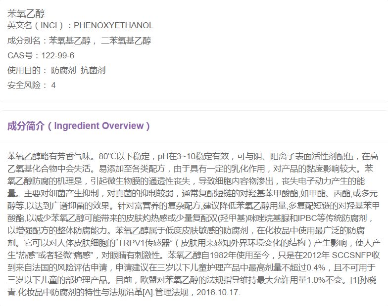 苯氧乙醇比较常见,是很好的溶剂和防腐剂,常被用作羟苯酯类和其他防腐剂的复配溶剂。敏感皮用上后会有明显的刺激感,不建议使用。