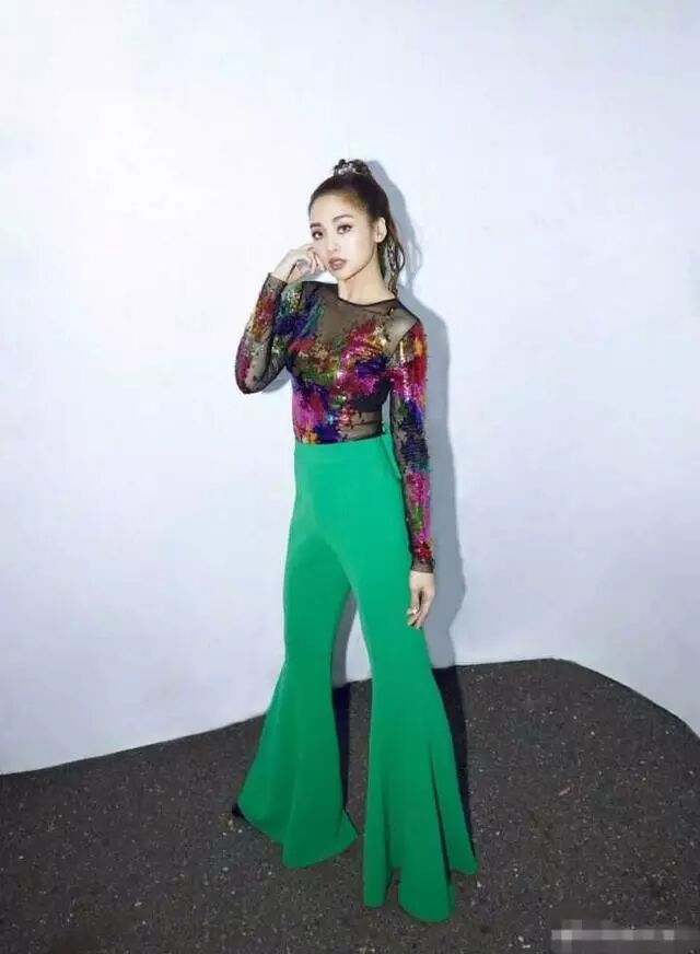 黑色薄纱上衣,亮片点缀性感迷人,搭配设计感十足的绿色阔腿裤,编发造型炫酷新潮,嘻哈范十足。