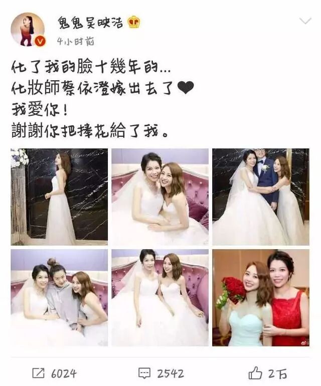 鬼鬼吴映洁的化妆师举办婚礼,鬼鬼也到场参加,据悉,这位化妆师为鬼鬼化了十年的妆,可见两人感情十分好,鬼鬼还幸运的抢到了捧花,粉丝们也纷纷催鬼鬼快点嫁人。