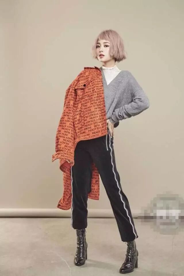 灰色V领卫衣内搭白色蕾丝花边打底衫,披上一件橙色字母印花外套,下身搭配黑色长裤,脚踩黑色短靴,短发造型又酷又美。