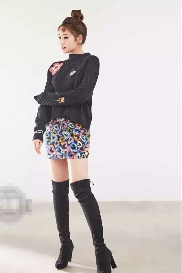 身穿黑色毛衣,花朵印花靓丽动人,搭配黑色心形印花半身裙色彩感满分,脚踩一双黑色过膝长靴,超显腿长,扎起丸子头可爱俏皮。