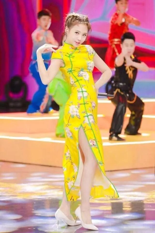 参加节目身穿一袭明黄色改良旗袍,花朵元素点缀增添活力,修身设计完美展现好身材,旗袍的开叉设计秀出纤细长腿,脚踩乳白色高跟鞋,女人味十足。