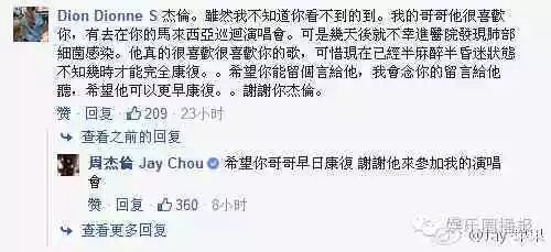 随后,周杰伦暖心回复,写道:“希望你哥哥早日康复,谢谢他来参加我的演唱会!”此留言惹得众网友纷纷激动不已,留言点赞道:“这样的杰伦怎能不爱?”“太暖了!”“既然开了脸书,请照顾下大陆喜欢他的歌迷,微博也考虑下吧!”