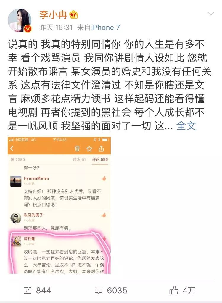 李小冉看到评论坐不住了,直接霸气回应,“某女演员的婚史跟我没有关系”,否认谣言。