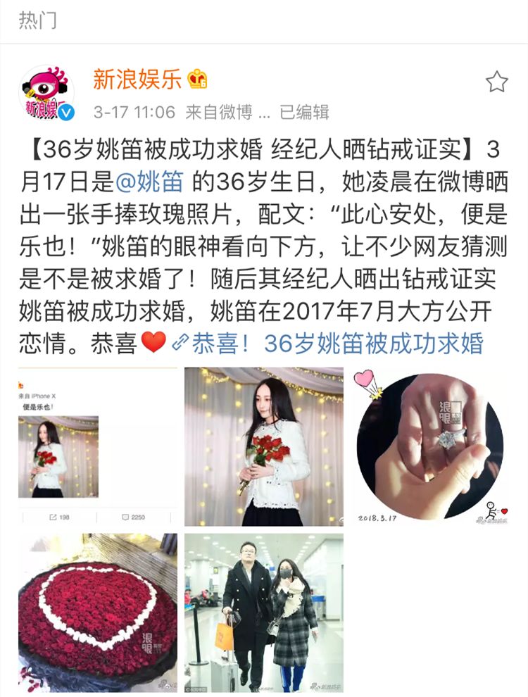 随后经纪人还晒起了钻戒,证实姚笛确实被求婚了。