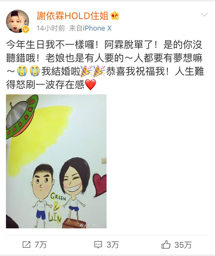 这几天娱乐圈喜事连连,前几天传言林志玲言承旭准备举行婚礼,昨天媒体报道余文乐妻子怀孕了,今天谢依霖又宣布自己准备结婚了。网友:啥??你啥时候有的男友?