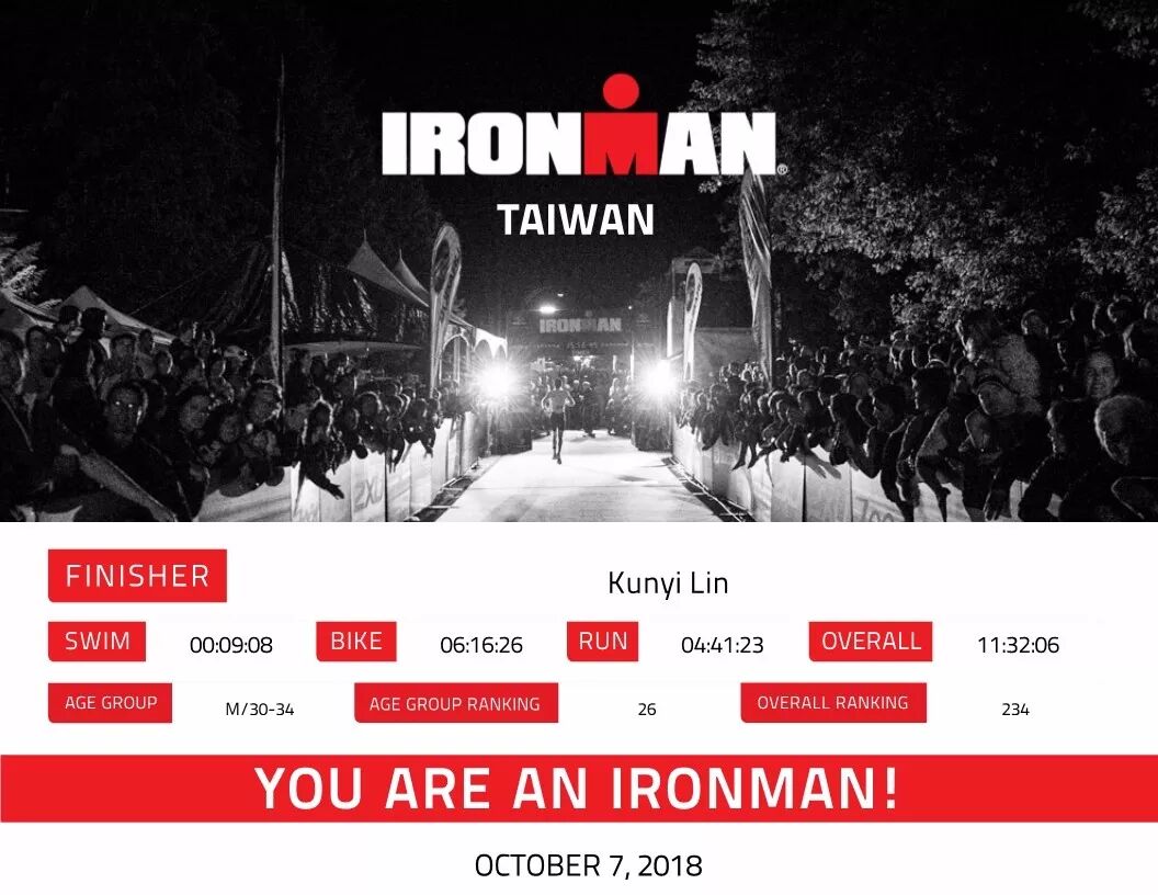 高举双手冲过终点线,听到主持人高喊:“LIN KUNYI, You are IRONMAN.”还是激动了一下,但我知道这次不算数,我要真正征服的大铁在下一场。