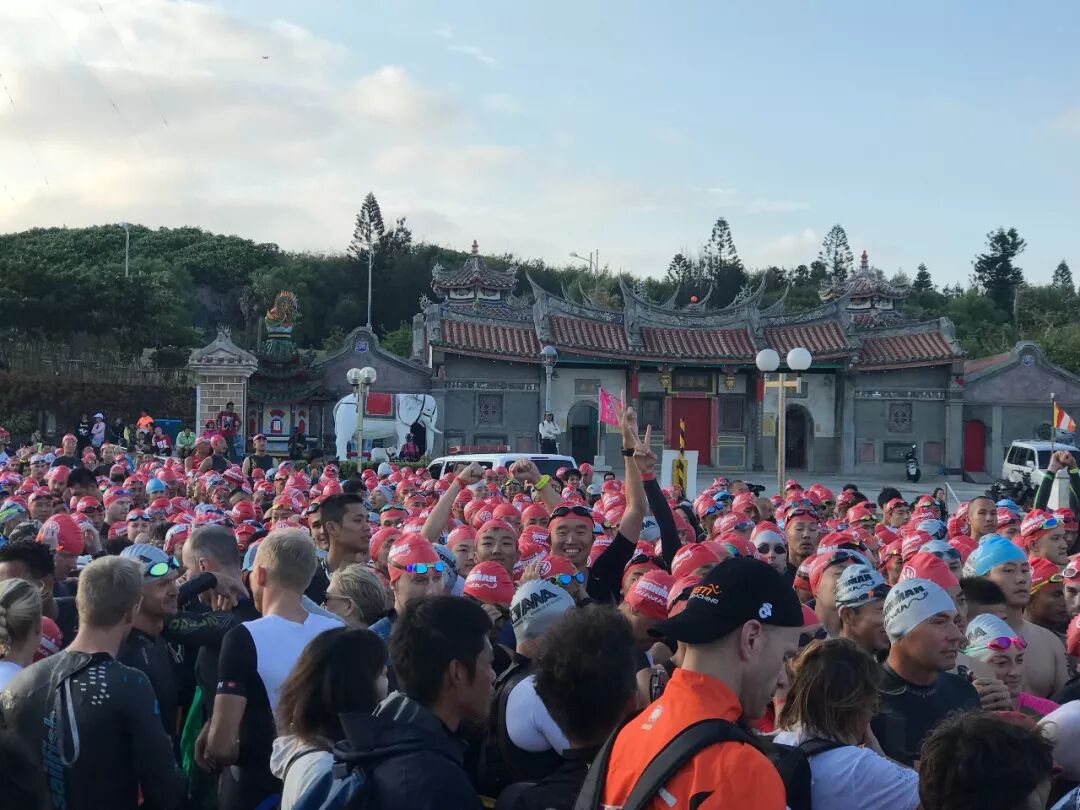 比赛推迟1小时开始,每个人都在游泳出发区等待着,因为只游400米,我决定不穿胶衣了,小孙和黄老板也把胶衣脱了。随着职业组的出发,我们这些年龄组选手的出发时间也临近了,我一直很期待和大铁选手们站在起点的那一刻,在赛前,我就跟黄晔说过,我想体验村上春树所描述的那种感觉。