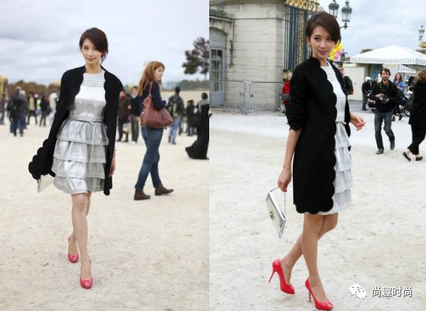 再看这一套,衣服的配色上没有违和感,但这双高跟鞋真的是谁穿谁腿短。不是越时尚的鞋子就越好看,上脚好看才能算真的好看。可能也就志玲姐姐的美腿能HOLD住这双鞋了。