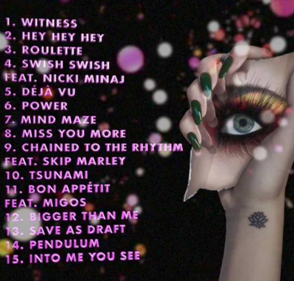 《Chained to the Rhythm》是《Witness》放出的首支单曲,一经发行便登上Billboard百大单曲榜第四名。