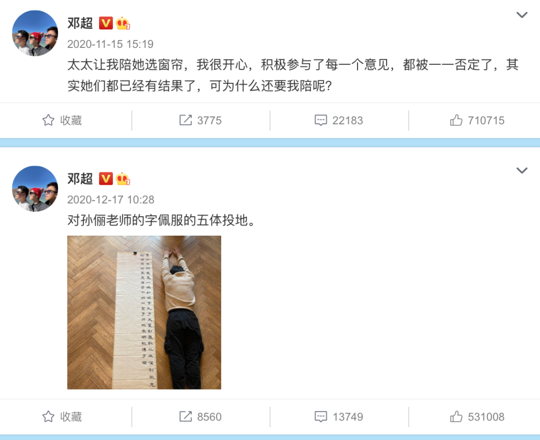 邓超微博里,很多内容看似在吐槽,但我们却总能从中品味到浓浓的甜蜜和快乐。