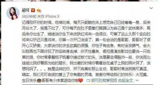 凌晨一到胡可:“记得刚怀你的时候,吃啥吐啥,每天只能躺在床上感觉自己已经奄奄一息,后来月份大了,倒是不吐了,可你每天在肚子里拳打脚踢以为自己是个武林高手,再后来你出生了,姥姥说你生下来皮肤红将来一定很白,可等了这么久那个变白的将来似乎还只是将来,你第一次开口说话了,第一句会说的是哥哥”。