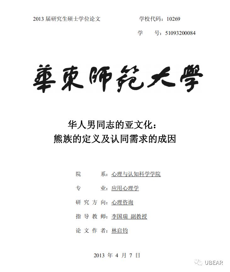《华人男同志的亚文化:熊族的定义及认同需求的成因》系本人在华东师范大学攻读学位期间在导师指导下完成的硕士学位论文,本论文的研究成果归华东师范大学所有。本人同意华东师范大学根据相关规定保留和使 用此学位论文,并向主管部门和相关机构如国家图书馆和“知网”送交学位论文的印刷版和电子版;允许学位论文进入华东师范大学图书馆及数据库被查阅、借阅; 同意学校将学位论文加入全国博士、硕士学位论文共建单位数据库进行检索,将学位论文的标题和摘要汇编出版,采用影印、缩印或者其它方式合理复制学位论文。