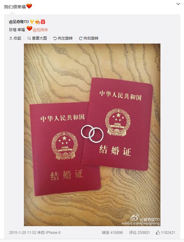 2015年1月20日,两人终于修成正果。吴奇隆通过微博晒出结婚证与戒指,并表示“珍惜幸福,随后刘诗诗也转发了该微博,并称“我们很幸福”。