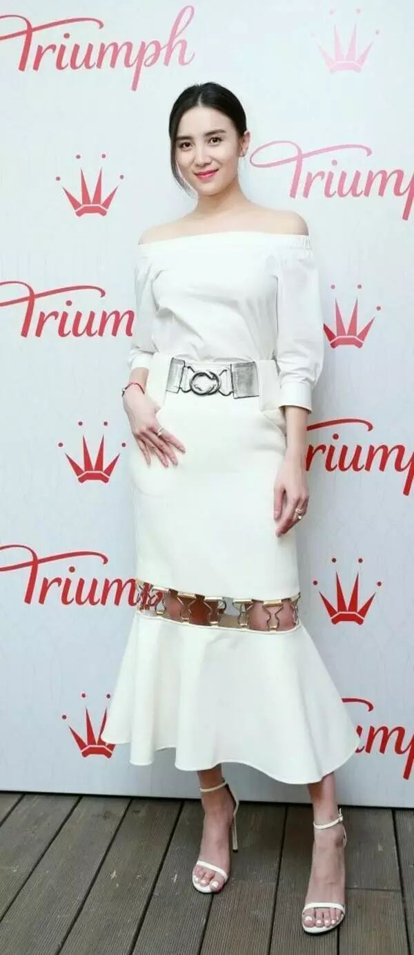 ▼同样是穿半身裙的江疏影,亮色质感的一字带凉鞋缩短了视线横截面宽度,搭配高腰裙增加高度。