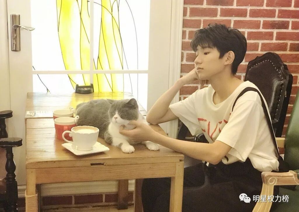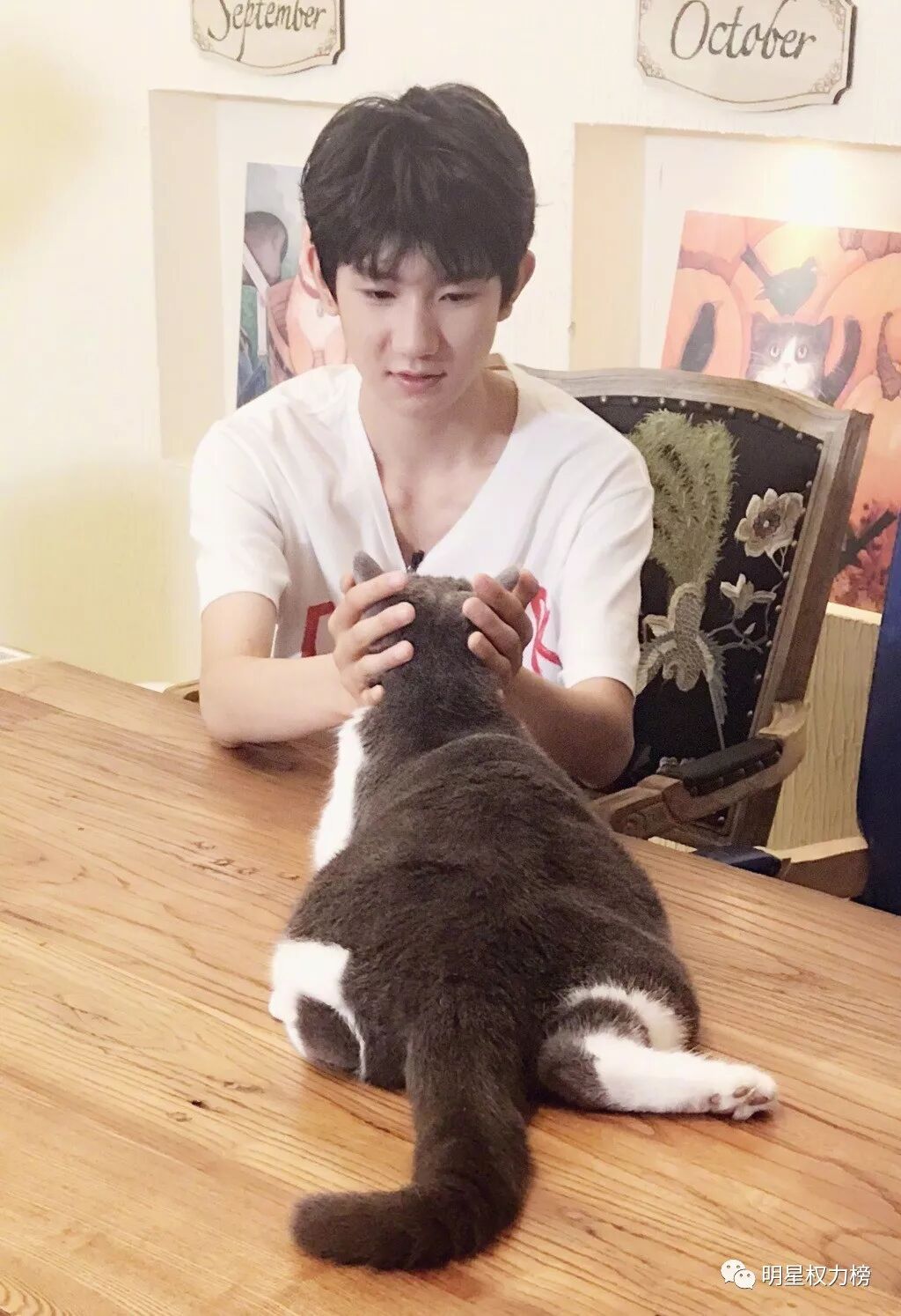 看王源挑逗猫咪的手势四八四还挺有气势,少年与猫玩的敲开心。