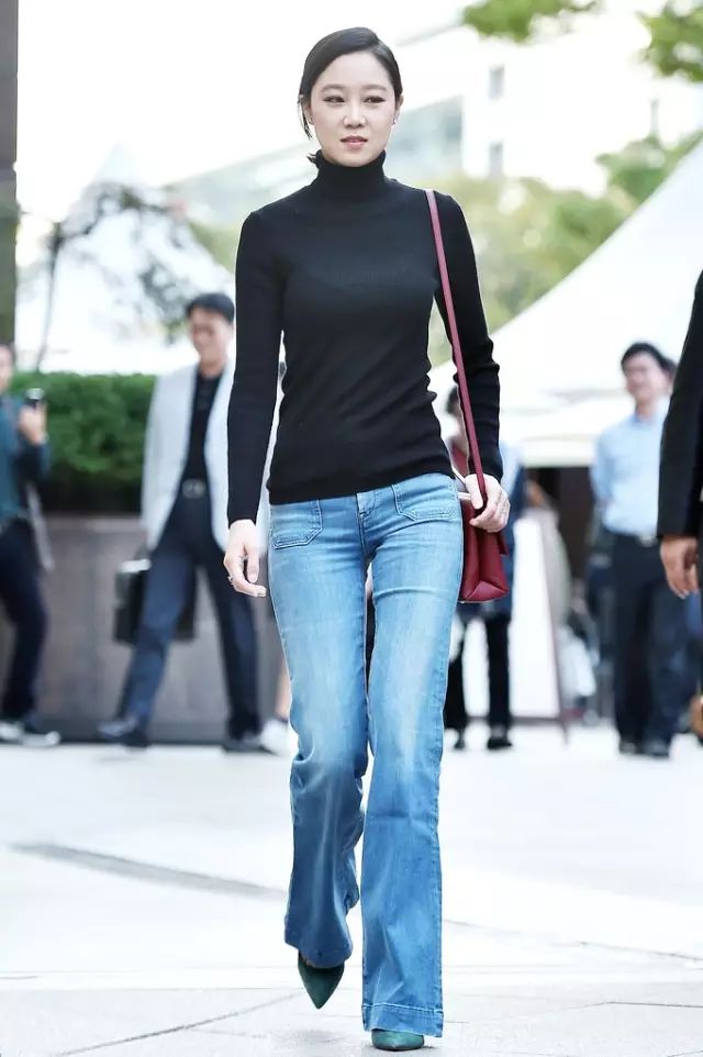 一个黑色高领秋衣+喇叭牛仔裤+尖头高跟鞋,走接地气的亲民路线。