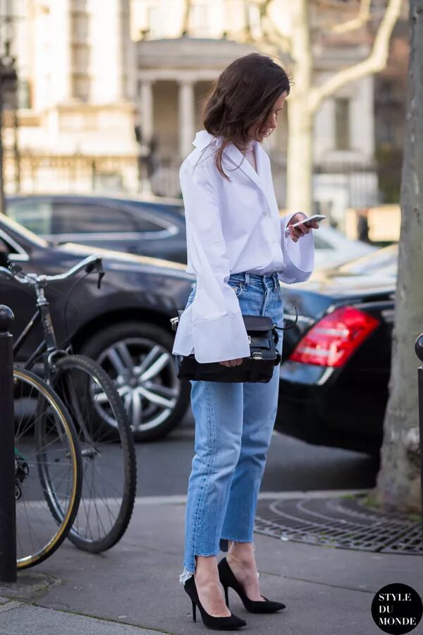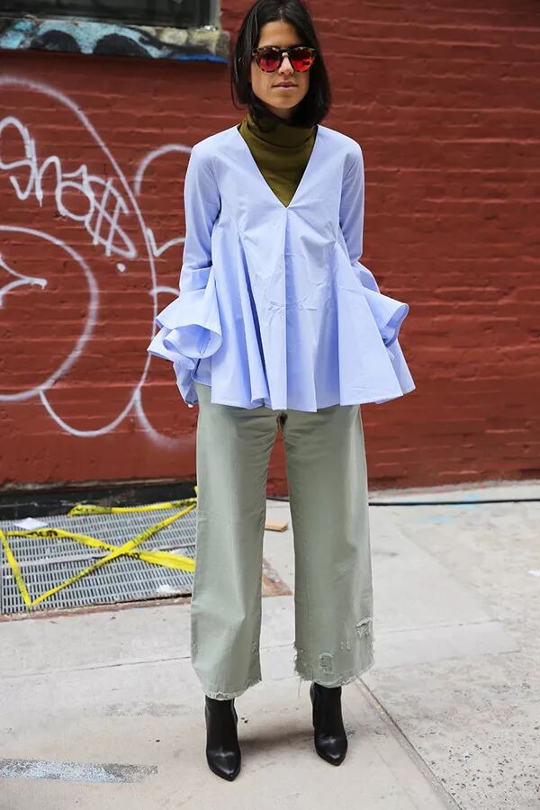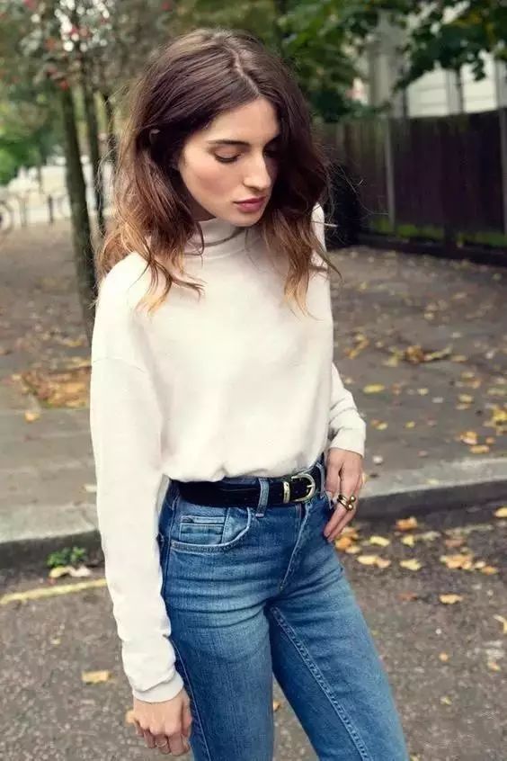 今年爆火的喇叭袖衬衫与浅粉色高领衫的搭配真是好看得要死,而且这类Oversize的衬衫最适合跟做旧的纯色牛仔裤搭配,衣服束进裤子里,将高领衫弄成堆堆领的效果,随性潇洒到不行。
