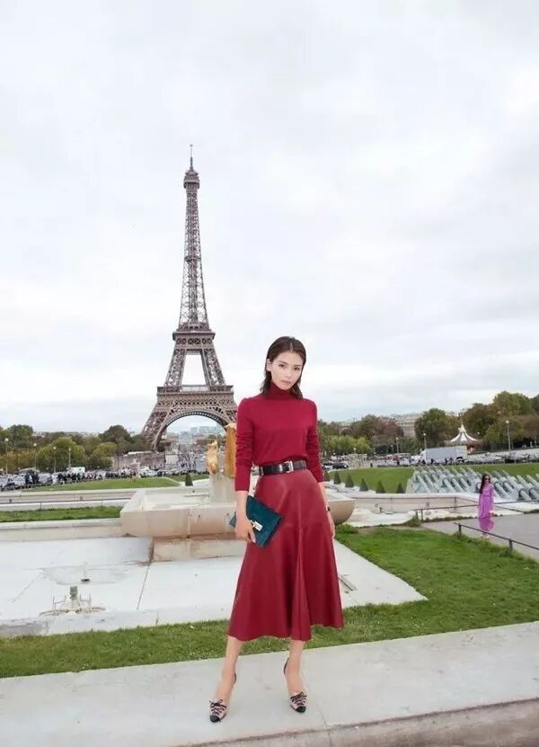 同色系搭配,是在太养眼了,红色让人喜悦,让人心情愉快。红色皮质伞裙,不同材质的碰撞又让秋冬更加有诱惑力。