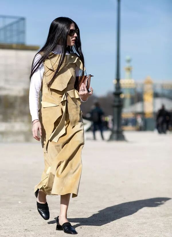 一件优雅质感的麂皮连衣裙与高领衫打造一个文艺又复古的造型。