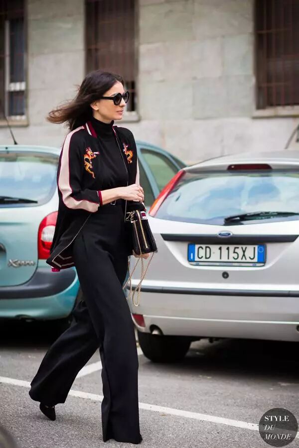 选择用更柔软、剪裁更富线条的宽松款式进行层叠,边走边飘。 另外,高领衫也可以穿在这种有刺绣风的夹克里,个性十足。