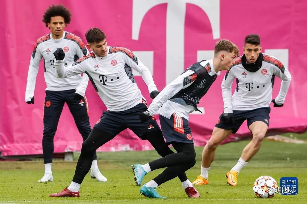 ●4月5日,拜仁慕尼黑队球员卢卡斯·埃尔南德斯(左二)在训练中。当日,德甲拜仁慕尼黑队在德国慕尼黑进行训练,备战欧洲足球冠军联赛四分之一决赛首回合对阵西甲比利亚雷亚尔队的比赛。