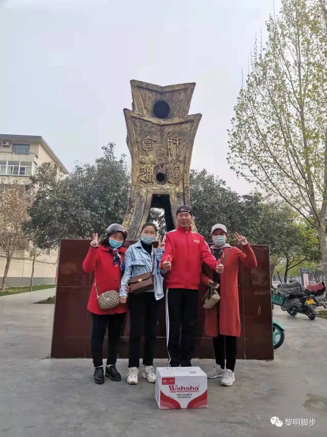 ●林州红旗渠黎明脚步公益跑团李广州,和来林州爱心广场捐赠娃哈哈纯净水的美女们在一起。
