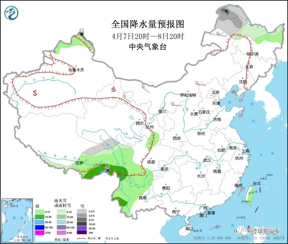 ●4月7日20时至8日20时,新疆北部高海拔地区、内蒙古东北部、黑龙江北部、西藏东北部、青海南部等地的部分地区有小到中雪或雨夹雪,其中新疆北部高海拔地区、黑龙江西北部等地局地大雪或暴雪(10~13毫米)。新疆北疆北部、西藏东南部、川西高原南部、云南西部和北部、台湾岛等地的部分地区有小到中雨,其中西藏东南部局地大雨(25~40毫米)。内蒙古大部、甘肃河西、河北北部等地的部分地区有5~6级风。渤海、渤海海峡、黄海北部和中部海域、台湾海峡、南海北部和中部海域将有5~6级、阵风7级的大风。