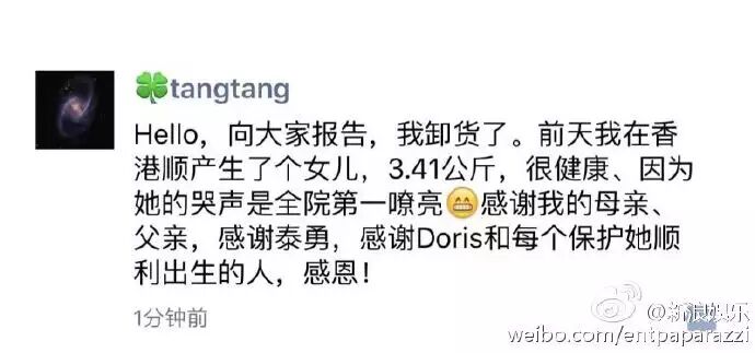 汤唯生女汤唯今日报喜称前天在香港顺产生了个女儿,3.41公斤。母女平安。汤唯2014年8月与韩国导演金泰勇结婚,今年2月宣布怀孕。恭喜!!。