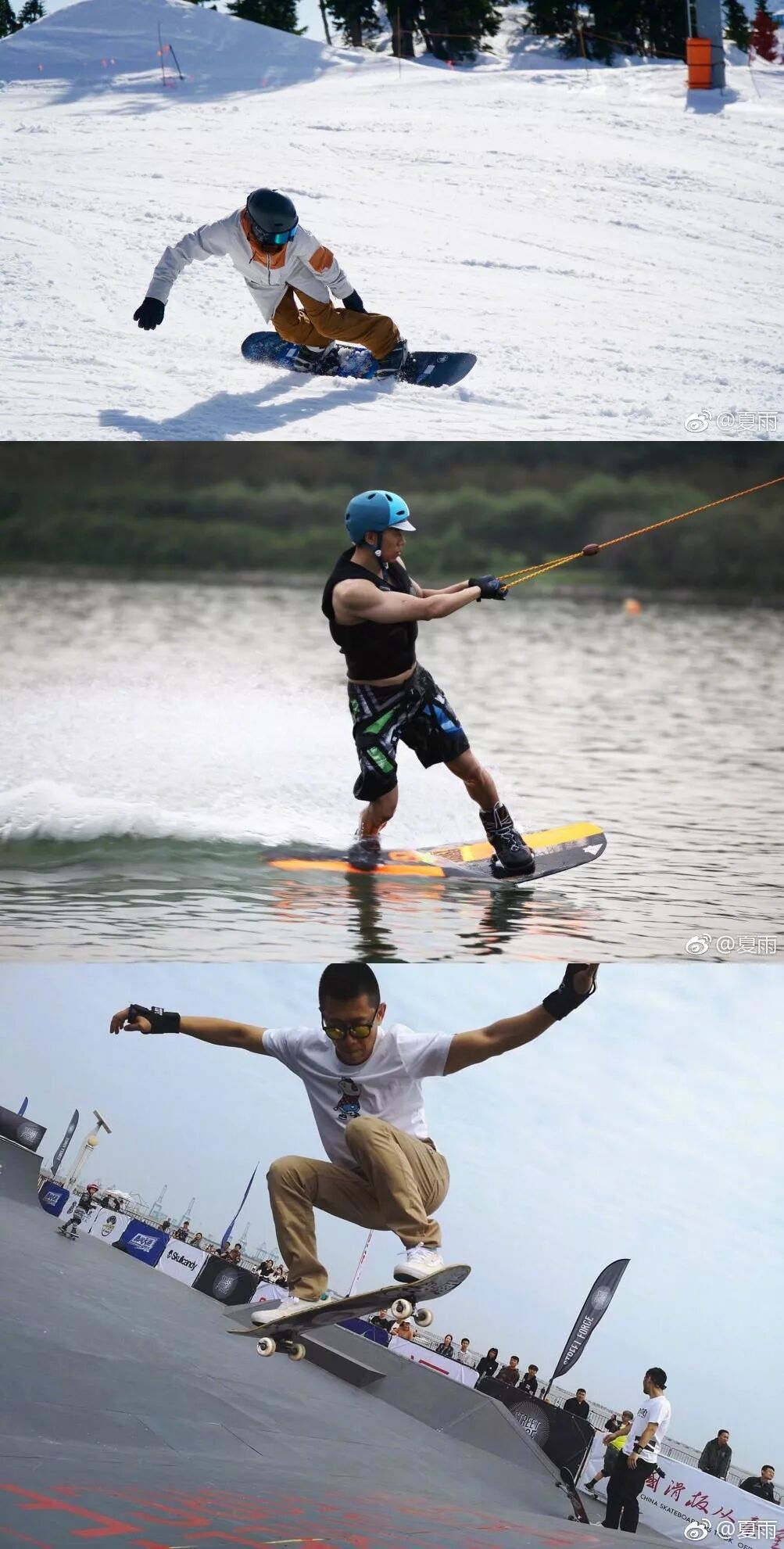 即便是结婚后有了女儿,他依然热爱冲浪、滑雪、滑板,甚至在索契冬奥会第一次当单板滑雪比赛的解说嘉宾。
