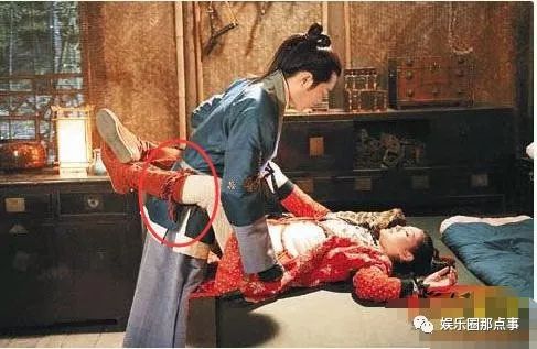 《大内密探零零狗》中,大S以双脚夹紧古天乐,前一个镜头鞋子上没有这跟鞋带,后一秒又绑上去了。
